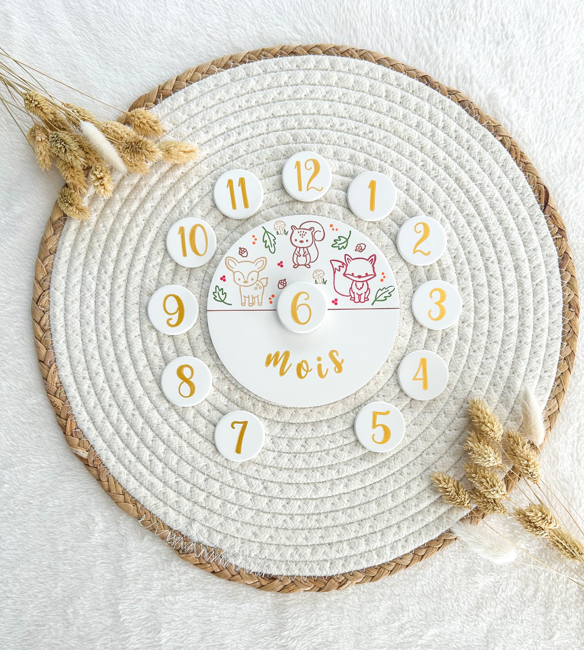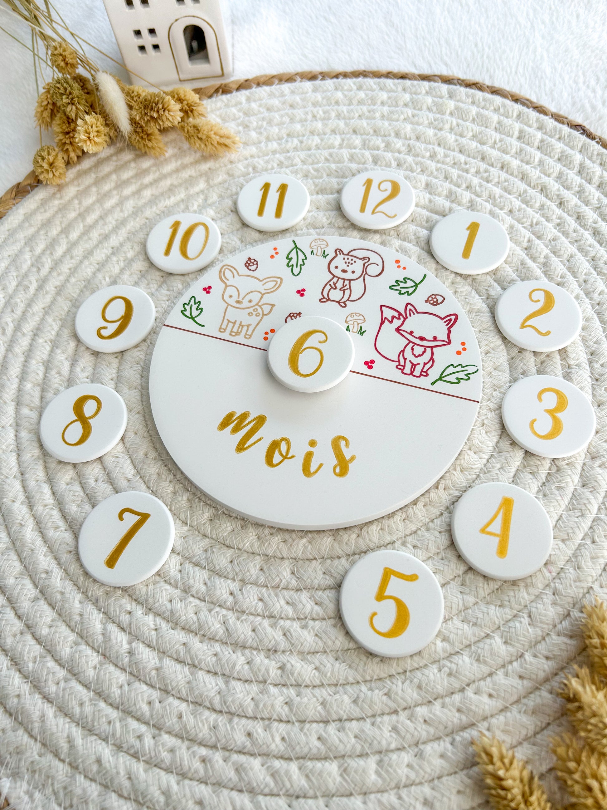 Ici, vous trouvez une jolie carte en argile coulée et décorée à l'encre sur le thème FORÊT, accompagnée de ses 12 cercles en argile coulée représentant les mois de 1 à 12.