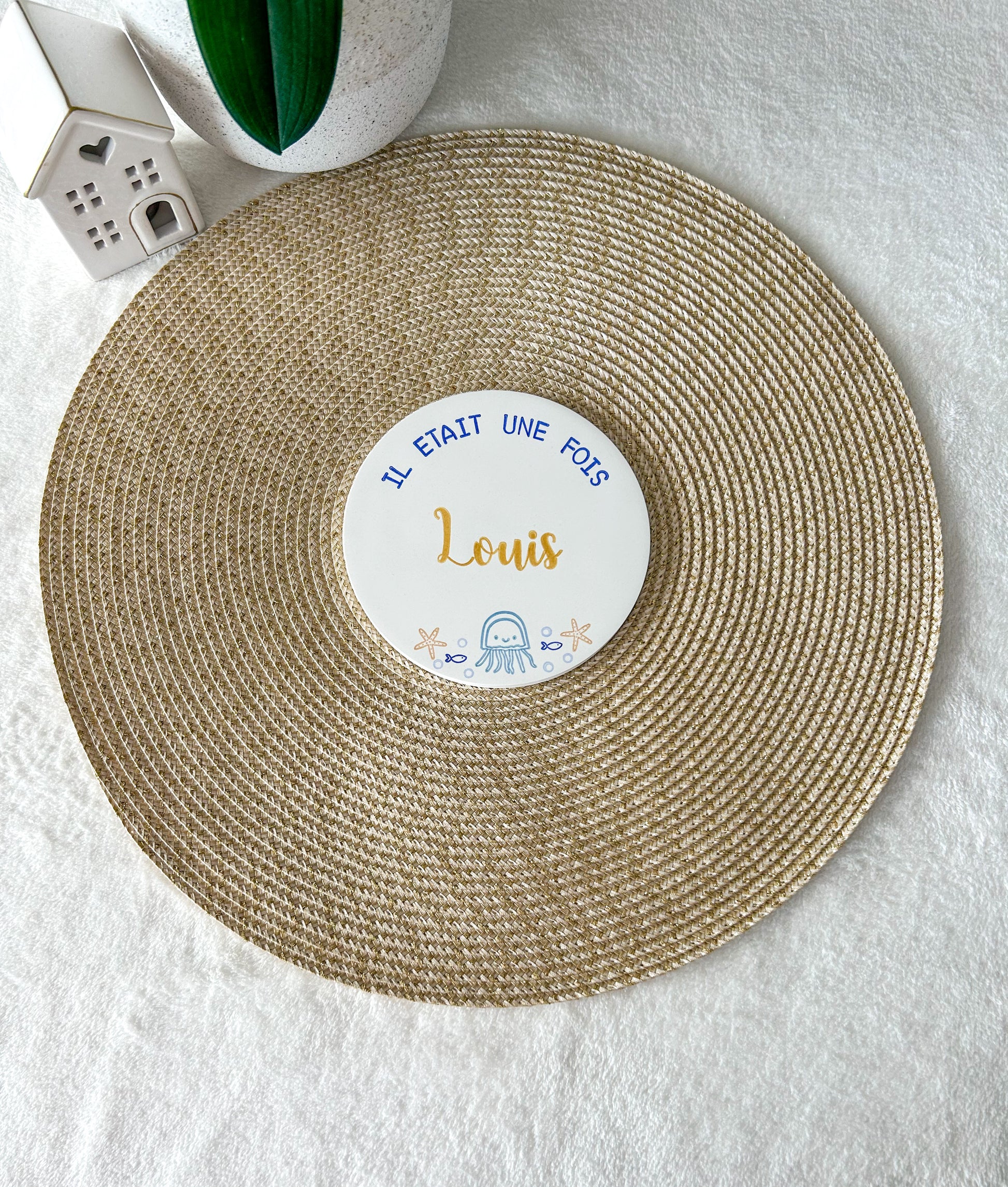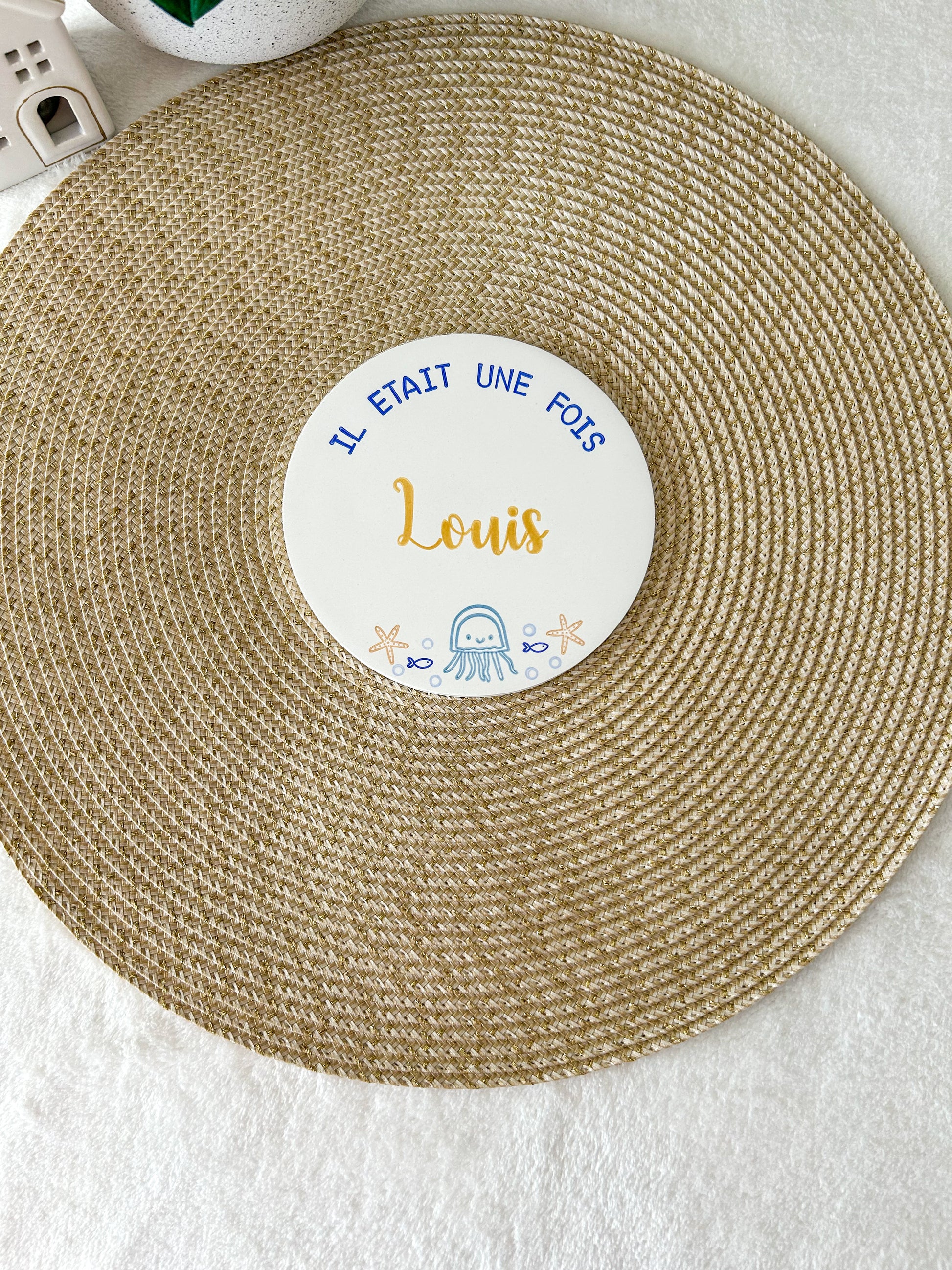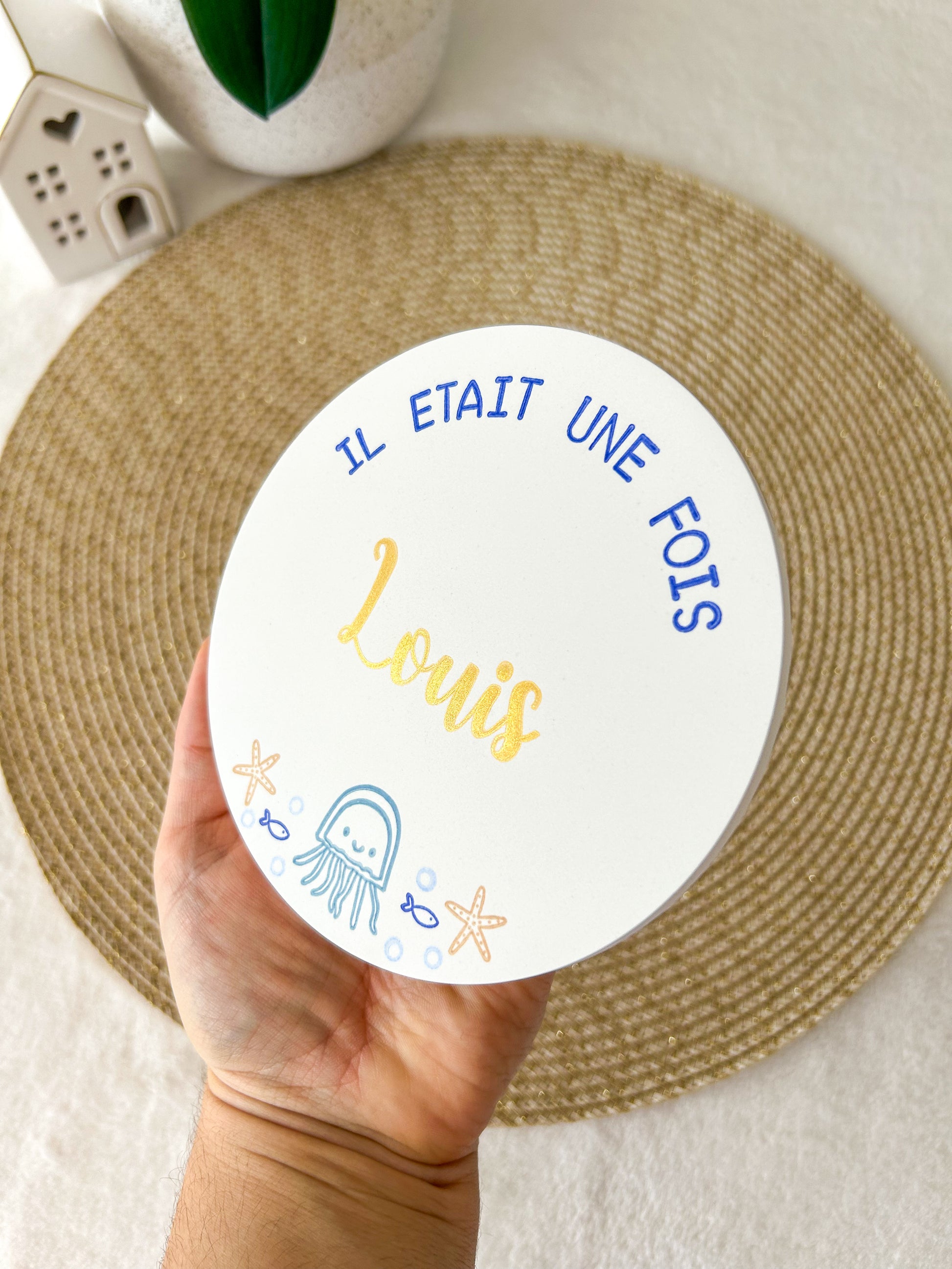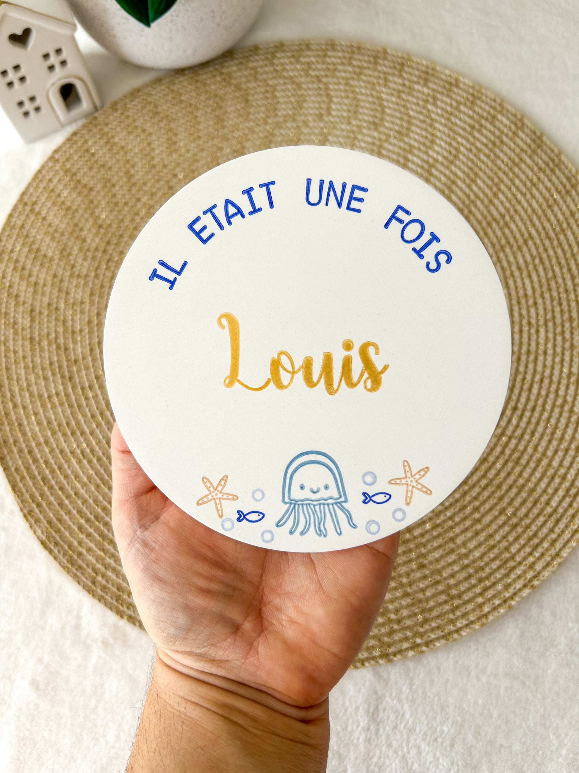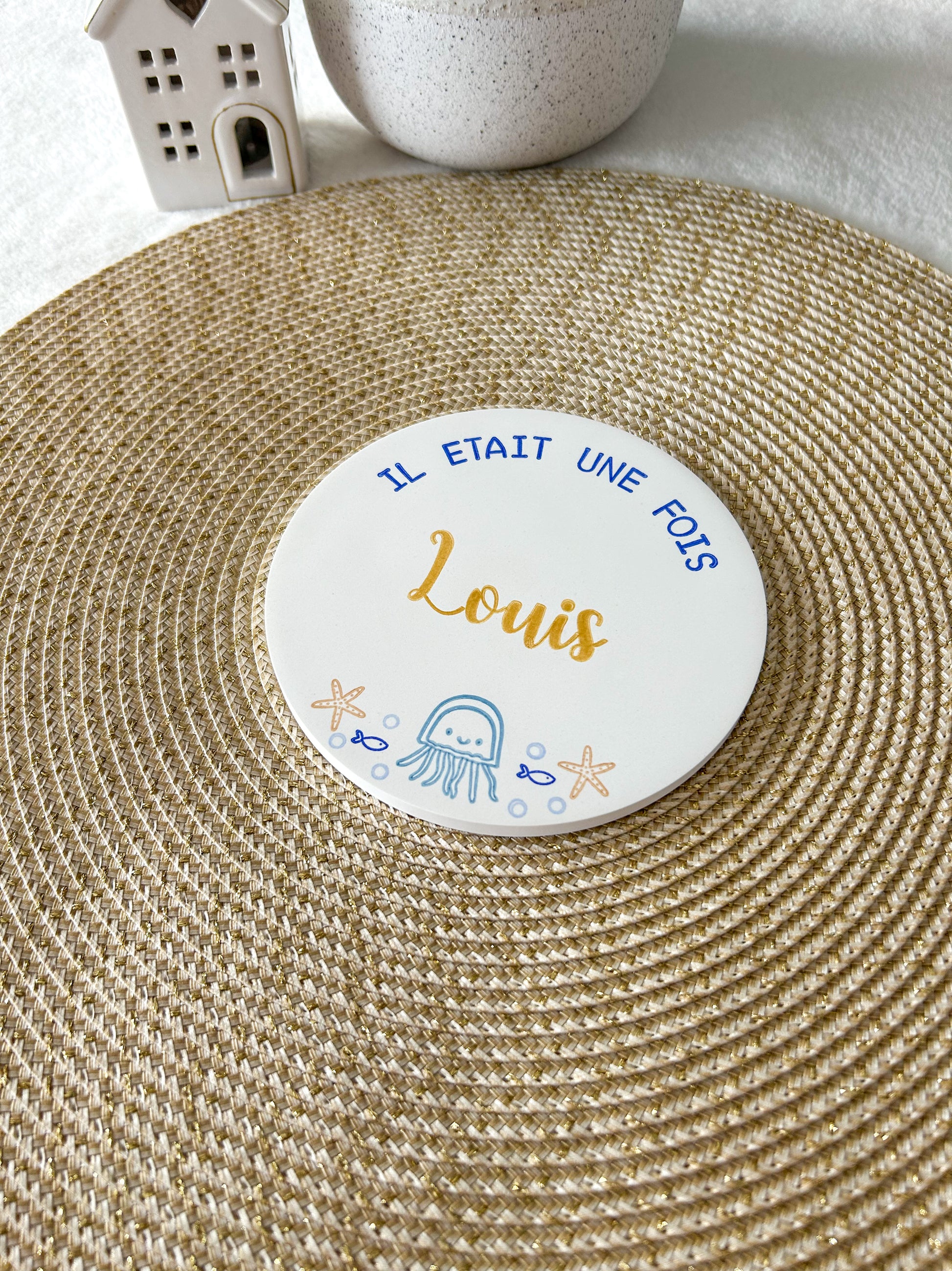 Ici, personnalisez une jolie carte en argile coulée et décorée à l'encre sur le thème OCÉAN avec le prénom de votre enfant.